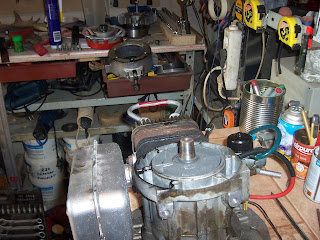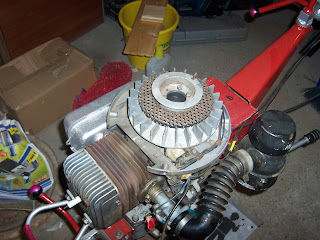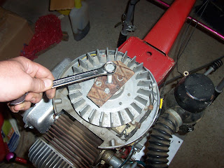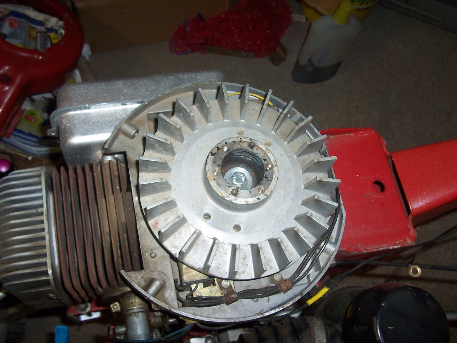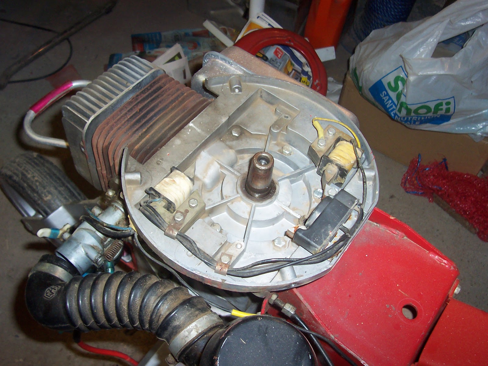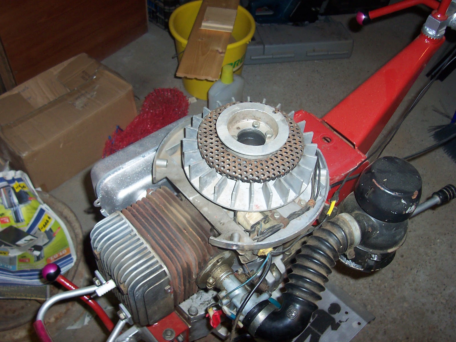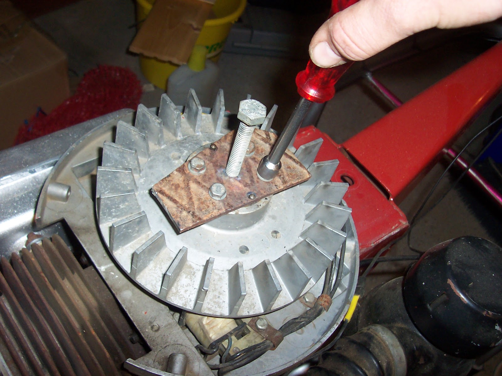 Rátettem a célszerszámot a ventillátorra, majd megkíséreltem a tenelytől való eltávolítását. Persze, ez nem sikerült, mert a bitang főtengely elforgott, nekem meg nem volt elég kezem, hogy megfogjam. Ekkor villant át az agyamon, hogy kellene ide egy nyél...(szerkesztői megjegyzés: a képek csak illusztrációk, a való életben Laokoón szoborcsoporthoz hasonló mutatványok történtek, de hál istennek, nem volt itt senki, aki lefényképezett volna)