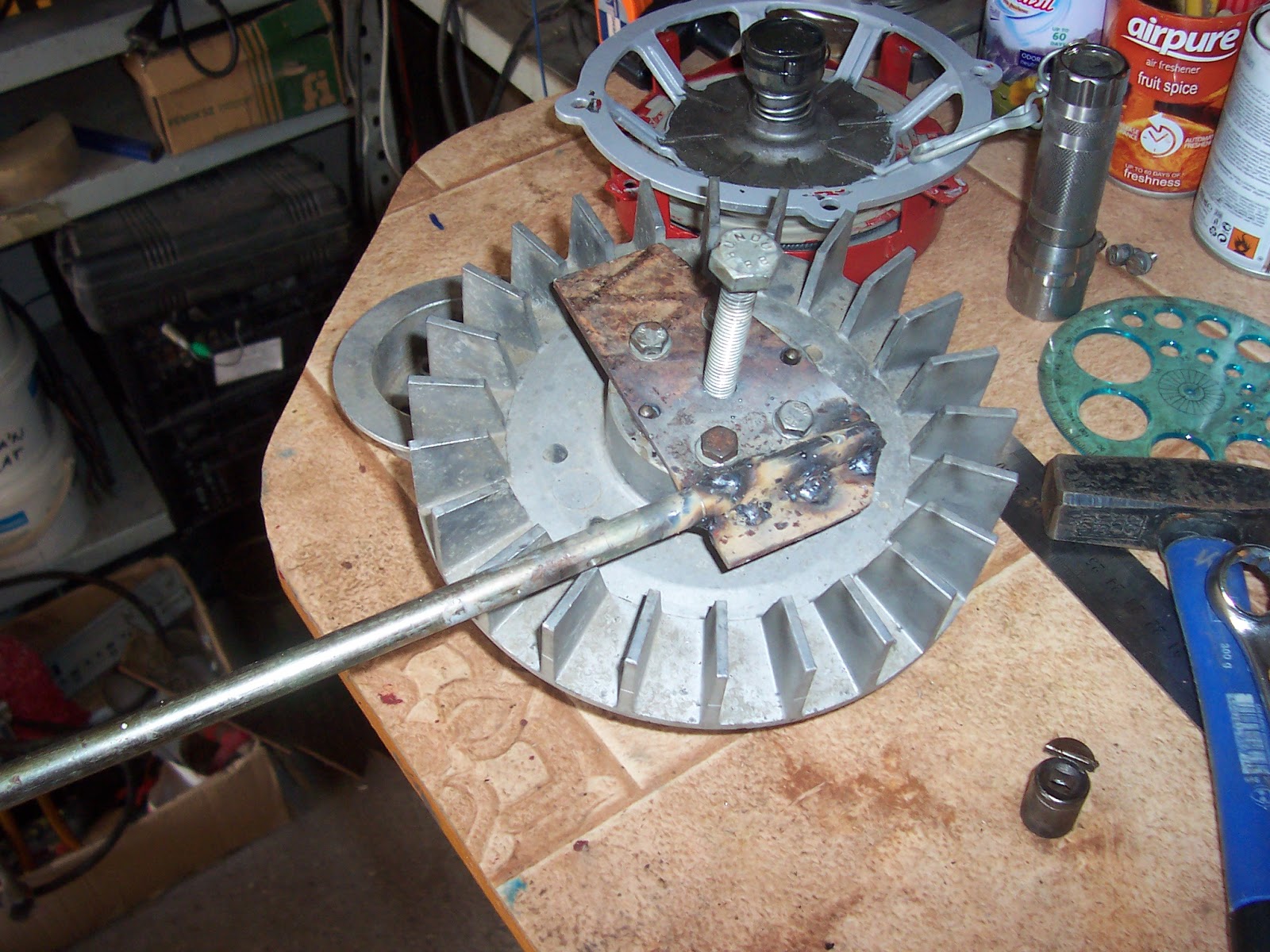 Következik a ventillátor levétele a tengelyről. Ez szintén alu öntvény, szóval óvatosan! Én személy szerint nekiálltam és barkácsoltam- illetve összehefteltem- hozzá egy levevő célszerszámot: